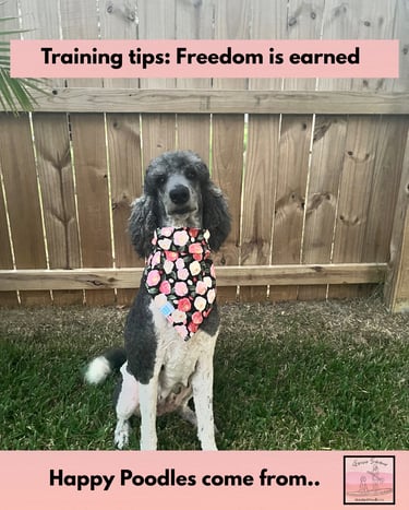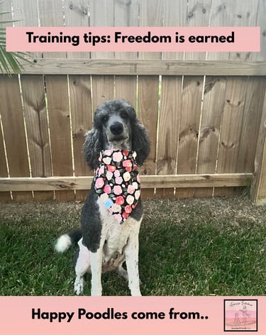 Bringing home a Standard Poodle puppy like Sweetie is exciting, joyful, and—let’s be honest—a little chaotic. Puppies are curious by nature, and intelligent breeds like Standard Poodles are especially creative when it comes to finding trouble. Chewing shoes, sampling pillows, and testing potty boundaries are not acts of defiance; they’re simply signs of a puppy who hasn’t yet been taught what freedom looks like. At Forever Summer Standard Poodles (FSP), one of our core training philosophies is simple but powerful: freedom should be earned, not given. Puppies don’t instinctively know the rules of your home. Sweetie doesn’t understand that the couch leg isn’t a chew toy or that the living room rug isn’t a potty area. Those expectations must be taught intentionally through structure, supervision, and repetition. Why Too Much Freedom Too Soon Backfires When puppies are given unrestricted access to the home before they’re ready, they practice unwanted behaviors—pottying indoors, chewing inappropriate items, or counter surfing. Puppies learn through repetition, so every mistake practiced becomes harder to undo later. At FSP, we often remind families that management is training. Limiting Sweetie’s access to the house doesn’t slow learning—it accelerates it. Fewer opportunities to make mistakes means more opportunities to practice correct behavior. Supervision vs. Containment When Sweetie is out and about, active supervision is essential. If you can’t keep eyes on her, that’s not a failure—it’s a cue to use management tools. Crates, playpens, baby gates, and tethers allow your puppy to stay safe while learning household expectations. Crate training is especially important. A properly introduced crate becomes Sweetie’s bedroom—a place where she can relax, sleep, and feel secure. At FSP, we recommend feeding meals in the crate and placing it near family activity so puppies associate it with comfort, not isolation. Earning Freedom Gradually Freedom should be expanded in small, intentional steps. Sweetie might start with one room, then two, then supervised access to larger spaces as she demonstrates reliability with potty training and chewing. This gradual approach builds confidence on both ends. Sweetie learns what’s expected of her, and you learn to trust her decisions. The End Goal: Confidence, Not Control At FSP, our goal isn’t to micromanage puppies—it’s to raise confident, trustworthy dogs who understand how to live comfortably in a human world. When Sweetie understands boundaries, freedom becomes a reward she can enjoy responsibly. That’s when a house truly becomes home.