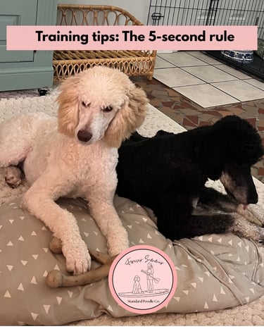 If there’s one rule we wish every new puppy owner understood, it’s this: corrections only work within about five seconds. Puppies live entirely in the moment, and Sweetie is no exception. If she chewed a shoe ten minutes ago, she has absolutely no idea why you’re upset now. In our daily work at FSP, we see how much stress disappears when families understand timing. The five-second rule helps you focus on what truly matters—catching and redirecting behavior in real time. If you see Sweetie starting to potty inside, chewing something inappropriate, or pulling on the leash, that’s your teachable moment. For potty accidents, pick Sweetie up and take her immediately to her designated potty area. For chewing, calmly remove the forbidden item and replace it with an approved toy. For leash pulling, change direction and reward her when the leash loosens. Once she’s doing the right thing, praise her generously—this is where learning sticks. If you miss that five-second window, let it go. Clean up, reset, and focus on better supervision next time. At FSP, we remind families that scolding after the fact only creates confusion and can damage trust, especially in sensitive breeds like Standard Poodles. One of our favorite prevention tools is tethering. Attaching a lightweight six-foot leash to your puppy keeps Sweetie close and prevents her from wandering off to make poor choices. Training isn’t about punishment; it’s about clarity, timing, and consistency.